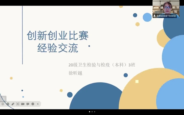 20级卫生检验与检疫(本科)3班徐昕越和大家交流了自己的创新创业比赛经验教会大家在赛前要鼓起勇气,认识自我,也告诉了大家在赛程中恒心、合作、细节、格局是最重要的。
