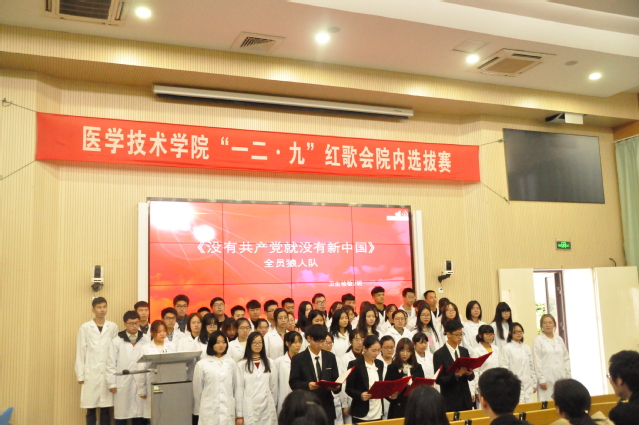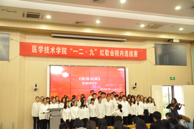 本次比赛共有8支队伍参赛,覆盖18级新生11个班级500多名同学。比赛现场,各班同学们热情高涨,声音洪亮,形式多样。18级医学营养、18级生物贯通与检验贯通的员工共同组队,他们用《七子之歌》的旋律,奏响澳门回归祖国怀抱的喜悦心声。18级医学检验技术本科1班的《红旗飘飘》唱出了对祖国的热忱,对梦想的不断追求。18级医学检验技术本科2班合唱《歌唱祖国》,他们用磅礴的气势唱响歌颂祖国走向繁荣昌盛的时代强音。18级卫生检验与检疫2班带来了《没有共产党就没有新中国》,他们用精彩的歌声演绎了在共产党的领导下,中国人民夺取抗日胜利、建立新中国的画面。“我们都有一个家,名字叫中国”,这首《大中国》,展现了祖国河山多姿多彩、民族团结的场景,18级医学检验技术本科3班的同学带着民族自豪感动情地歌唱。