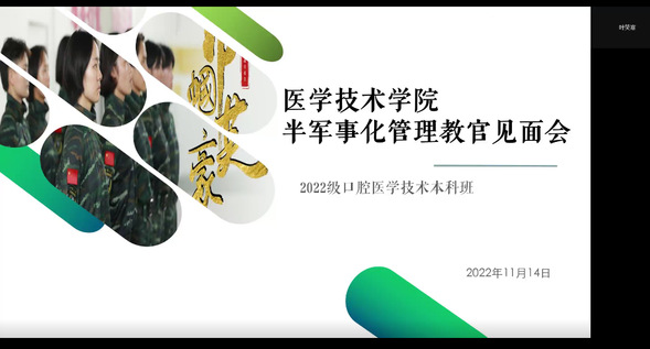 11月14日晚,2022-2023学年半军事化管理教官见面会在线上举行。于彬、韩佳航、徐源蔓、沈昊楠等四位教官与2022级口腔医学技术本科班全体同学在线上“会面”,伟德体育伟德体育官方网站辅导员王运佳、叶笑寒(实习)出席见面会,会议由叶笑寒主持。