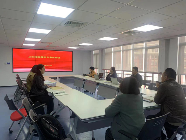 为稳步推进教研室教学改革工作有序进行,做好迎评促建的准备工作。3月16日下午,卫生检验教研室在北苑3号楼4楼平台会议室开展集体磨课专题教研活动。本次教研活动由教研室主任芮闯主持,教研室全体成员参加研讨。公司教学副经理陈凤贞、陈林军莅临现场指导。