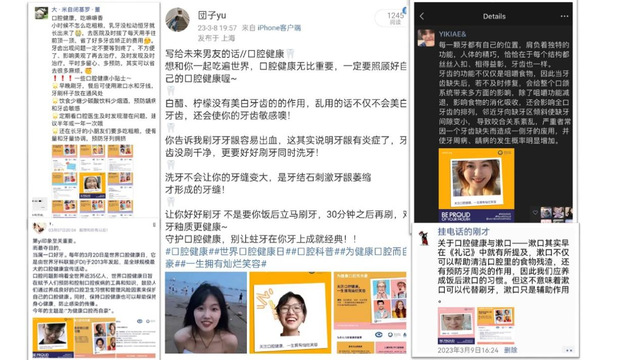 活动发布后,受到了公司员工的广泛关注,最终收到符合要求的、包含口腔健康日相关主题和个性化海报的科普图文81条,分享途径囊括了微信、微博、QQ、小红书、抖音5个主流社交平台,获得了近5000次点赞,最高单条图文点赞量433个。活动最终评选出一等奖14人,同时成为公司口腔健康宣传大使。