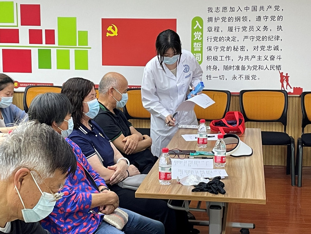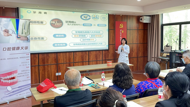 首先,义诊团队成员们发放了线下调研问卷,了解居民们对口腔健康知识的了解程度。随后,由周璟老师主持讲座,2020级口腔班詹汀兰同学对社区居民开展了为时30分钟的《老年人口腔保健》小讲座,内容聚焦口腔健康知识科普,紧扣老年人关心的问题,包括口腔健康标准、老年人常见口腔健康问题及老年人口腔保健的内容与方法。在流畅的宣讲过程中穿插着精彩的互动环节,拉近了与居民的距离,居民们对这种线下面对面交流的科普宣讲表示认同,好评热烈,社区居民们的口腔保健意识明显提升。