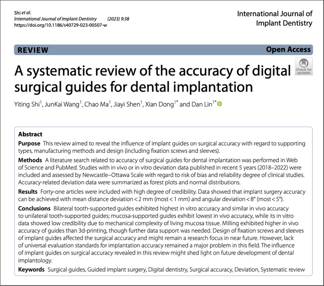 2023年10月25日,一篇由口腔医学技术专业林丹老师、董晛老师作为通讯作者指导2020级口腔医学技术(本科)2班的史懿婷、王骏恺、马超和沈佳懿同学共同完成的文章《A systematic review of the accuracy of digital surgical guides for dental implantation》(口腔种植数字化导板精度的系统综述)正式发表。
