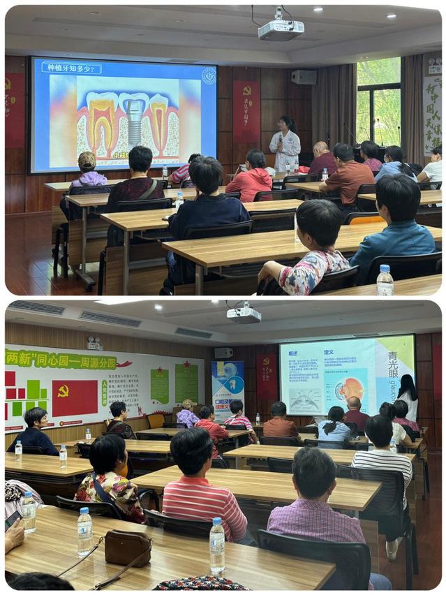 活动开始,由口腔、眼视光专业员工志愿者为居民带来科普讲座,普及正确的刷牙方法和定期口腔检查的重要性,以及青光眼等疾病的预防与治疗。在互动答疑环节引导群众科学就医,倡导健康生活方式。随后开展口腔与视光基础检查及咨询、眼镜维修及清洗等服务,为居民检查牙齿健康状况,进行视力检查和验光,并提供相应的改善和就诊建议。
