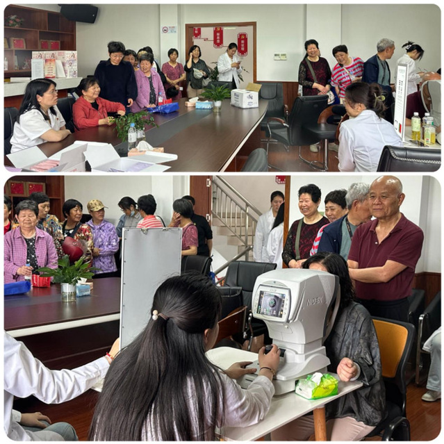眼视光专业教师和员工志愿者们正在为居民们进行视力检查和验光