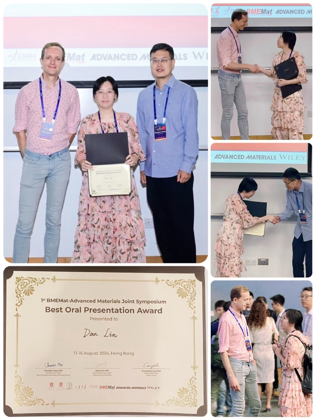 8月16日会议闭幕式与颁奖礼上,林丹老师荣获最佳口头报告奖,由顶刊Nature BME和AM主编亲自颁奖;林丹老师与Nature BME主编进行学术交流