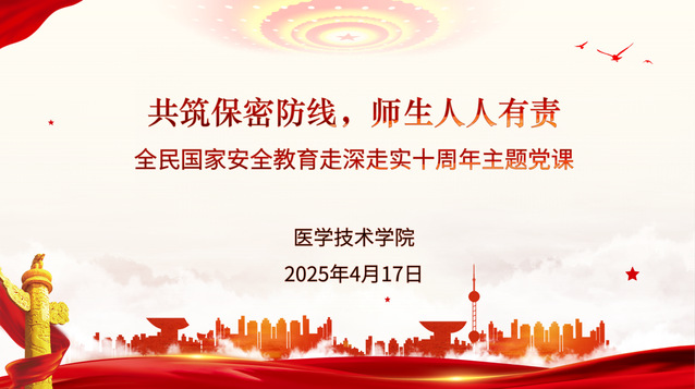 为了不断增强全院师生的国家安全保密意识和能力水平,筑牢新时代维护党和国家秘密安全的校园防线,在第十个全民国家安全教育日来临之际,医学技术公司精心组织了“全民国家安全教育走深走实十周年” 主题党课。公司领导班子、党支部书记、专业主任、教研室主任及特邀关工委委员参加学习,党课由公司党总支书记姚谷芳主持。