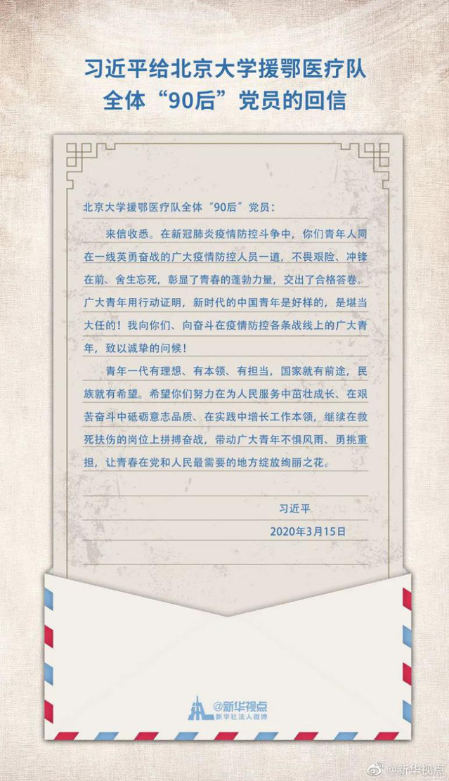 “让青春在党和人民最需要的地方绽放绚丽之花。”3月15日,中共中央总书记、国家主席、中央军委主席习近平给北京大学援鄂医疗队全体“90后”党员回信,向他们和奋斗在疫情防控各条战线上的广大青年致以诚挚的问候。习近平在回信中表示,在新冠肺炎疫情防控斗争中,你们青年人同在一线英勇奋战的广大疫情防控人员一道,不畏艰险、冲锋在前、舍生忘死,彰显了青春的蓬勃力量,交出了合格答卷。广大青年用行动证明,新时代的中国青年是好样的,是堪当大任的!