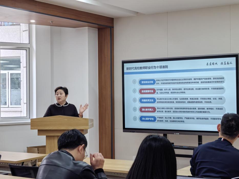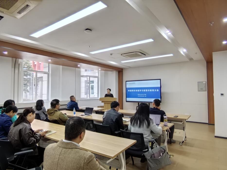 党总支书记姚谷芳领学了《新时代高校教师职业行为十项准则》《新时代高校教师职业行为“十不准”行为》,她指出,“十项准则”和“十不准”行为是行为底线和职业红线,是全体教师日常开展公司产品、学术科研等工作的基本遵循。随后,姚谷芳结合教师师德失范典型案例,深入剖析案例背后的思想根源、行为危害与深刻教训,用“身边事”警醒“身边人”。她强调,党的十八大以来,以习近平同志为核心的党中央高度重视教师队伍建设,特别是师德师风建设。希望全院教职工要始终坚守底线,不越红线,以“捧着一颗心来,不带半根草去”的精神投身教育事业。
