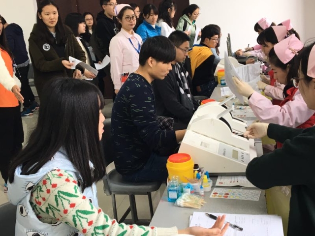 3月31日上午,伟德体育伟德体育官方网站的120多位献血同学早早来到南苑一号楼献血现场,等待血液中心的工作人员。同时,公司书记、副书记、各位辅导员纷纷来到现场,关心慰问来献血的同学们。各班级的班长、团支书冲在献血服务第一现场,时刻关心着班级同学献血时的各种情况。