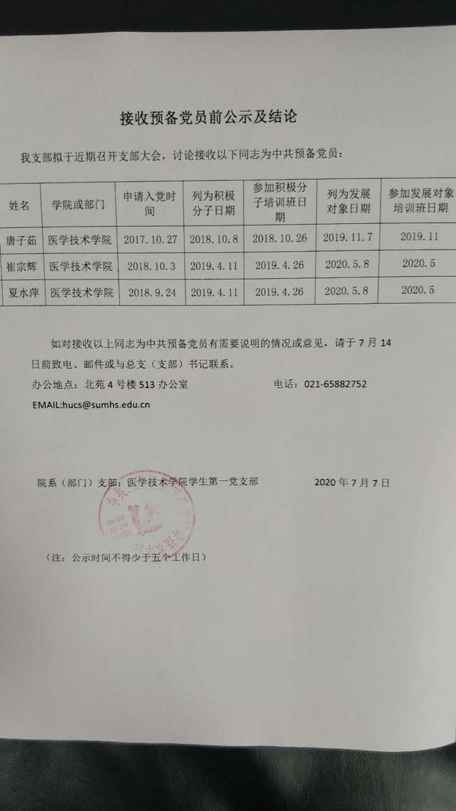 接收预备党员前公示(员工第一党支部)