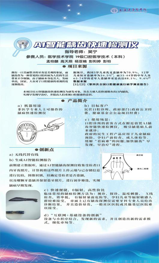 该AI智能龋齿快速检测仪具有便携、操作简便、智能生成报告等特点,与传统口腔行业的商业模式相比有所创新;产品批量生产成本相对较低,用户范围广,具有广阔的市场前景,具有一定的商业价值;该项目有企业全程参与,在校企合作项目中可积极的示范作用。