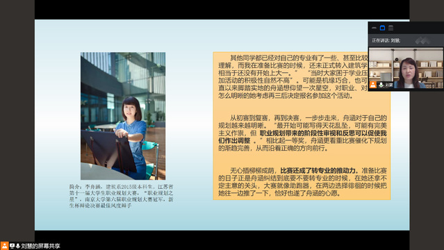 2020年职业生涯规划大赛就要拉开帷幕,为更好地帮助同学们备赛,10月12日下午公司邀请到了南京大学员工就业指导中心副主任刘慧老师在线上以“生涯规划构建精彩人生”为主题开讲。本次健康讲堂由彭楠老师主持,200余位同学在线参与。