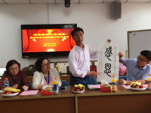 6月21日,伟德体育伟德体育官方网站在北苑3207会议室隆重举行退休教职工欢送会暨金培成老师书画作品分享会,公司党政领导、原工会主席、专业主任、教研室主任、教师代表和工会委员一起参加了欢送会,工会主席主持欢送会。