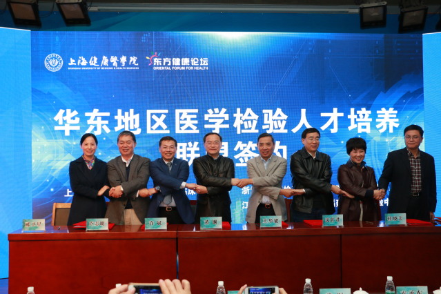 随后,由伟德体育伟德体育官方网站分别与上海市临床检验中心、江苏省临床检验中心、浙江省临床检验中心、山东省临床检验中心、安徽省临床检验中心、江西省临床检验中心、福建省临床检验中心签订医学检验人才培养联盟协议,上海市卫生和计划生育委员会副主任衣承东、上海健康医公司党委书记郑沈芳为联盟揭牌。接着由伟德体育伟德体育官方网站校领导分别为六省一市临床检验中心的专家颁发兼职教授聘书,希望通过行业专家参与公司人才培养共同提升医学检验人才质量,将人才校内培养与社会行业需求高度融合。