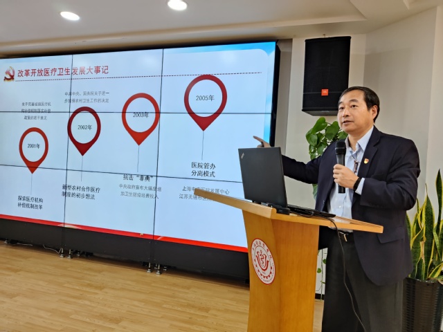 党课从前言、改革开放医疗卫生发展大事记、医疗卫生改革的思路、医疗卫生改革成就、健康中国背景下的伟德体育伟德体育官方网站等五个内容开展。沈国芳副董事长从2019年我国卫生健康事业发展统计公报的数据讲起,结合我国医疗卫生发展的大事记,从具体的事件深入浅出地介绍了我国医疗改革的总体状况。从过去到现在,从缺失、不完善到趋于完善,沈国芳的讲话层层递进、为全体教师展示了我国医疗卫生事业的变迁过程。讲到健康中国战略的发展时,他强调了习近平总书记就健康中国建设发表的一系列重要论述的意义,回顾了2012年8月党中央提出“健康中国2020”战略研究报告,再到2019年6月关于实施健康中国行动的意见等一系列健康中国战略的发展历程。对于“健康中国2030”规划,沈国芳详解读,联系公司发展实际,他认为全体教师要投身健康中国事业,发挥主观能动性,做到人人参与、人人尽力、人人享有。结合师生齐参与的“医之魂——医学人文油画及雕塑展”、“悦读润道品牌活动”以及“传承红医精神”等特色建设项目为例,沈国芳对当前开展健康人文项目予以了充分肯定。