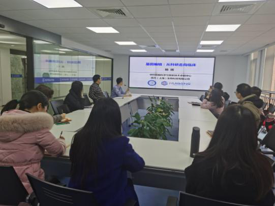 首先,李延飞副经理向老师们介绍了杨辉教授的学术背景、研究领域。随后杨辉教授作了专题报告。他介绍了“什么是基因?什么是基因编辑?基因编辑技术的发展历程等”,重点讲解了通过基因改造,获得高保真的单碱基编辑工具,极大地降低了基因编辑的脱靶率,为临床治疗单基因疾病提供了保障。同时,杨教授分享了自己的创业经历,几年来在该领域的研究成果不断被Nature、Science、Cell等国际顶级期刊刊出,得到了越来越多同行专家的认可和关注。他创立的辉大生物科技有限公司,目前已获两轮逾亿元的融资,将科研成果转化应用,致力于罕见病治疗,解除患者疾苦。