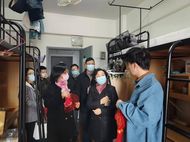 校院领导兵分两路走访了北苑11号、12号、13楼宿舍一共34个宿舍近150名员工。宿舍楼内,各位领导、老师和员工们亲切交谈,代表公司向春节留校员工送上节日的问候和新春的美好祝福。