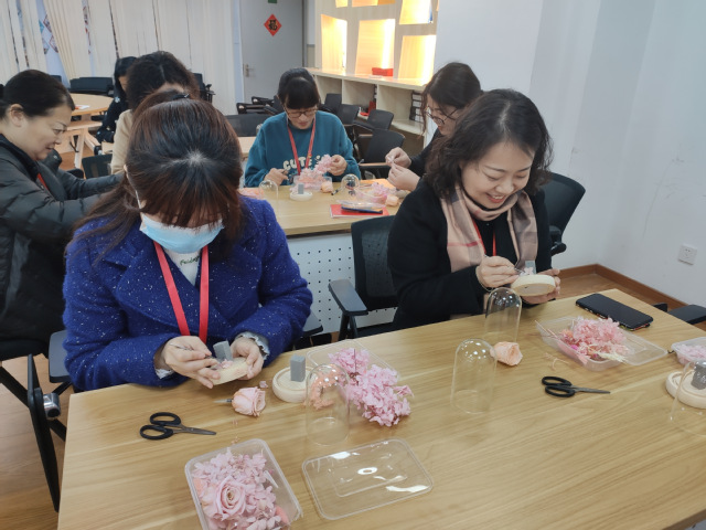 永生花也叫保鲜花、生态花,国外又叫“永不凋谢的鲜花”,其无论是色泽、形状、手感几乎与鲜花无异,既保持了鲜花的特质,而且颜色更为丰富、用途更高、保存时间更长,一直以来受到很多人的追捧。教职工在学习制作永生花的过程中,不仅获得了一次与花艺亲密接触、陶冶性情的机会,还在制作和交流中增进了同事之间的情谊,该项活动进一步增强了教职工的凝聚力和向心力!