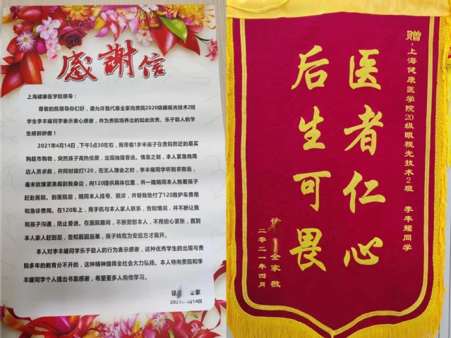 “回想女儿晕倒的那一刻,我不敢想象如果没有李同学的及时相助、女儿不能及时就医,会有什么后果。我们全家非常感激他。”那一晚,徐先生沉浸在感动之中。因为第二天就计划离开上海回山东,他连夜手写了一封感谢信。4月15日一早,他的妻子赶到宾馆附近的文印店,将信打印出来、并制作了一面锦旗,送到伟德体育伟德体育官方网站。她向该校医学技术公司党总支副书记高晓霞表达了一位母亲的敬意:“感谢公司,培养出医者仁心的员工!”