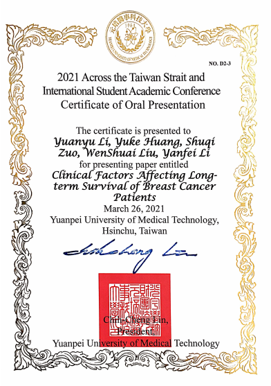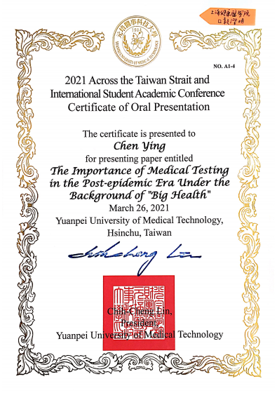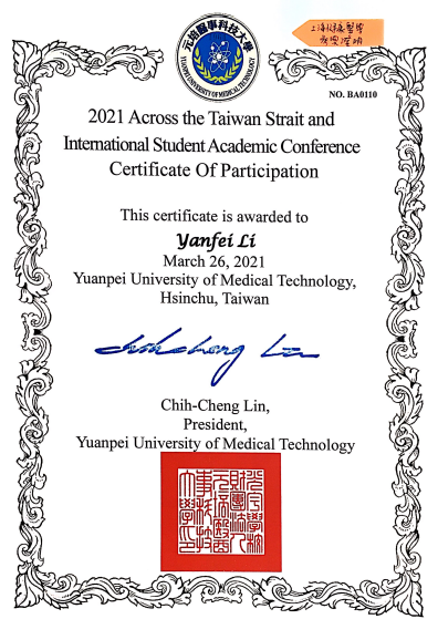 今年3月,2021年海峡两岸员工学术论文研讨会在北苑3号楼4楼平台会议室顺利举行,本次研讨会因疫情影响,依托线上网络平台进行。公司2018级医学检验技术1班马诗骅、蒋婧、朱轶昊,2019级医学检验技术2班陈滢、2020级眼视光技术3班左淑琪5位员工在李延飞、马琳琳、李钠三位导师的精心指导下,与来自全球15所高校的员工进行研讨交流。研讨会由公司医技公司和台湾元培医事科技大学共同举办。