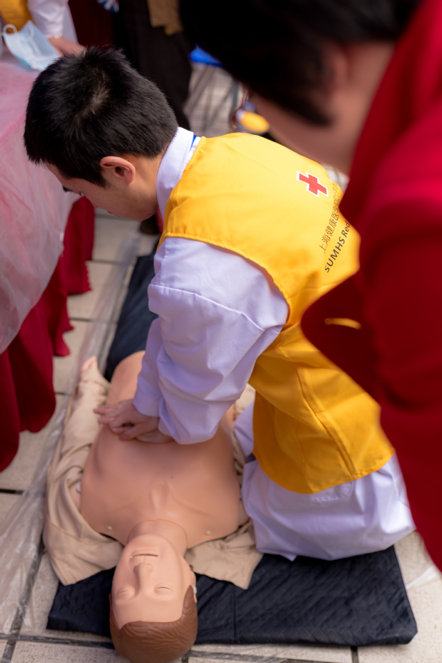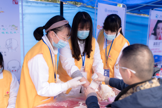 活动开始后,公司的志愿服务点人头攒动,校青年志愿者协会的志愿者们为市民提供了测量血糖血压和制作中药香囊的服务。并在测量完血压血糖后针对测量结果为市民提出饮食及锻炼等方面的建议,同时志愿者们还为市民提供了包含荆芥穗、紫苏、丁香、苍术、艾草五味药材在内的“紫荆”香囊,并在市民自主制作的制作过程中进行中药药效的相应讲解现场氛围十分温馨。校红十字会员工分会的志愿者们在现场展示了心肺复苏术的技能,并让广大市民们亲身体验其过程。让市民们了解到在突发情况下如何更好的在黄金时间开展自救与他救。同时,同学们还进行了伤口包扎的现场教学,指导市民关于日常烫伤等的包扎方法。此外,红十字会员工分会的同学们还为广大市民提供中医推拿及理疗服务并传授肩颈操,帮助白领以及老年人更好的预防并缓解肩颈疼痛。