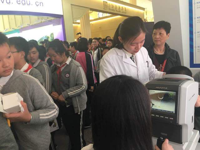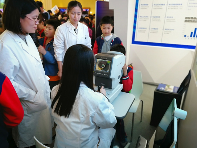 通过 “眼屈光检测”这一项目我们不仅可以了解眼球的屈光状态,以及决定配镜的屈光度数,该检测方法快速、简便、准确;专业的老师和志愿者同学们还为在场的家长们耐心介绍配镜处方,以及近视的防控知识。