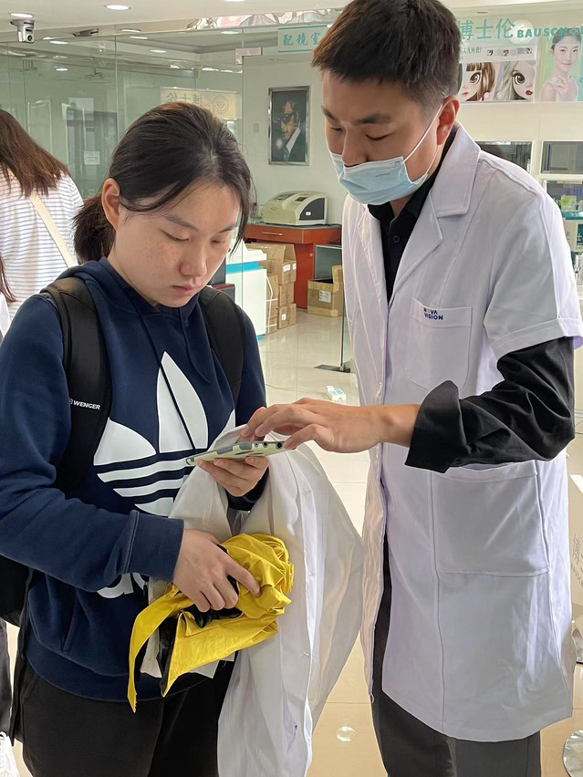 在活动现场,由星创视界眼视光专家团队带来了全自动眼健康筛查仪、数码裂隙灯等专业设备,叠加AI人工智能算法,在大约 2 分钟内筛查眼前节上千数据,形成关于双眼度数、昼夜视差、视疲劳、白内障、青光眼、圆锥角膜相关的风险报告,特别是AI眼底照相机可通过眼底视网膜,快速分析黄斑变性、病理性近视、糖尿病、高血压等 30 余种慢病并发症的病变风险,为员工们提供了专业筛查、AI预测、定期复查、电子档案管理等全流程服务。全校有300多名师生体验了本次眼健康筛查服务。由伟德体育伟德体育官方网站眼视光专业实训中心主任、上海市首席技师陆俊杰老师带领的“EYE健康”志愿者服务团队,在活动现场为员工们进行了视力检测、眼镜整形及眼镜镜片清洗等专业服务,并当场指导员工用眼习惯及隐形眼镜的护理小知识,在传递光明的同时,也让眼视光专业的员工志愿者能学以致用,对自身的专业技能和水平有了更深刻的领悟。对检查出有高风险眼疾的同学,也及时建议同学去医院复查眼睛,早发现早治疗,呵护好员工们的每一双眼睛。