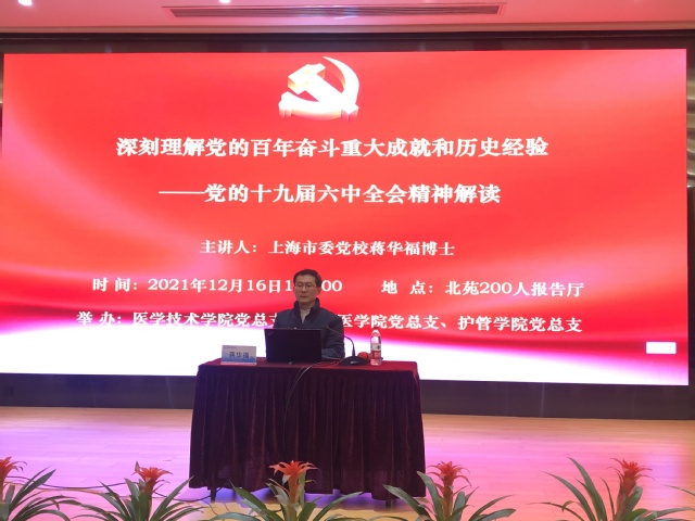 12月16日13:00,医学技术公司党总支、临床医公司党总支、护管公司党总支在北苑200人报告厅联合举办党总支中心组(扩大)政治学习,专题学习党的十九届六中全会精神。会议邀请国家安全与应急管理领域知名专家学者、中共上海市委党校专任教师蒋华福博士作“深刻理解党的百年奋斗重大成就和历史经验——党的十九届六中全会精神解读”专题辅导报告。三个公司的班子成员及全体教职工、员工党员代表参会学习。