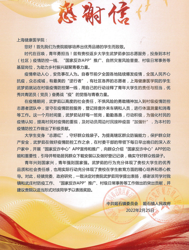 武梦茹平时就非常热衷公益事业,积极参与校内献血等活动。2021年下半年她加入上海挚光公益青年发展中心,并且先后担任手语培训引导员志愿者、周浦万达疫苗接种点志愿者、上海图书馆等志愿者。因表现突出,她被上海市黄浦区青年志愿者协会授予了志愿服务证书。应该说,武梦茹同学这次是把在上海参与志愿服务精神的带回了家乡。用她自己的话说:“能为疫情防控、乡村振兴贡献一份微薄力量,自己也很光荣”。在感谢信中,当地政府肯定了对公司人才培养的质量给予了高度肯定,对公司学子表现出的专业精神、高度的社会责任感予以赞扬。