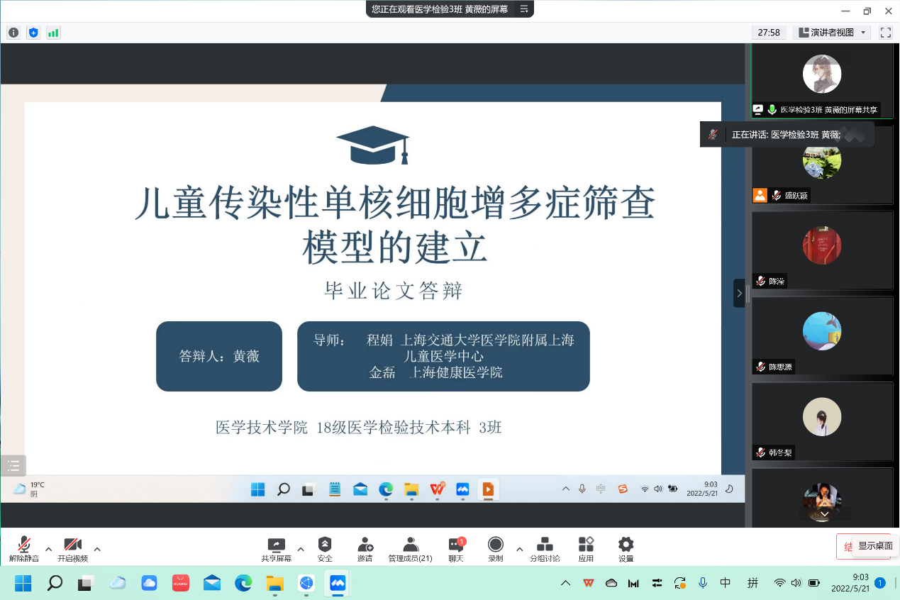 医学检验技术专业于5月21-22日顺利完成2022届本科生论文答辩。因疫情影响,本次答辩采用线上形式进行,总计212名本科生参加了答辩。