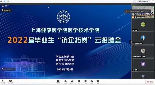 为进一步开拓岗位,深化校企合作,促进毕业生充分就业,7月8日上午,伟德体育伟德体育官方网站举办了2022届毕业生第三场“访企拓岗”云招聘会。在主会场有伟德体育伟德体育官方网站副董事长沈国芳、员工处副处长(主持工作)吕晓丽、员工处副处长慈兴强、校团委书记顾斐雯、员工工作办公室副主任王红、医学技术公司党政班子领导、专业主任及专兼职辅导员代表出席。中轻检验认证有限公司、上海兰卫医学检验股份有限公司、上海迪安医学检验所有限公司等13家相关企业负责人、线上家长、员工代表200多人参会,医学技术公司党总支副书记高晓霞主持会议。