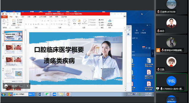 尚书老师展示《口腔内科学》“溃疡类疾病”章节的授课内容,她以众多的临床案例来为大家介绍了溃疡中主要的复发性阿弗他溃疡和创伤性溃疡,详细阐述溃疡的特征、临床表现、分类、鉴别诊断及治疗,针对不良修复体导致的创伤性溃疡,以小组学习的形式探讨不良修复体的损害、与技师关系等,融入技师与医师职责的思政元素。