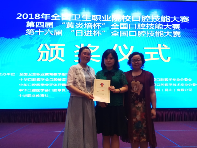 在与大赛同期举行的2018年全国口腔职业教育论坛上,公司口腔医学技术专业教师董晛在全国卫生职业公司产品指导委员会主办的青年教师授课技能展示中获得二等奖。这是全国卫生行指委首次开展口腔职业院校的授课技能展示比赛,来自全国27所口腔专业院校的老师参加了教案初选,最后12位选手进入决赛,决赛经过现场授课展示15分钟,最终评出全国一、二、三等奖各一名。