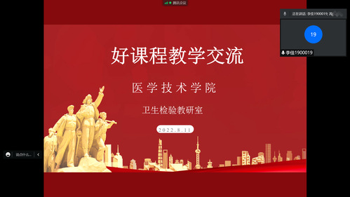 为了更好地应对本科教学工作合格评估,按照公司的工作部署,8月11日下午1点,卫生检验教研室全体成员齐聚线上,举行了第一轮“好课堂”教学交流活动。本次活动涉及三门课程,分别由褚小菊、李佳和芮闯三位老师展示课堂教学。